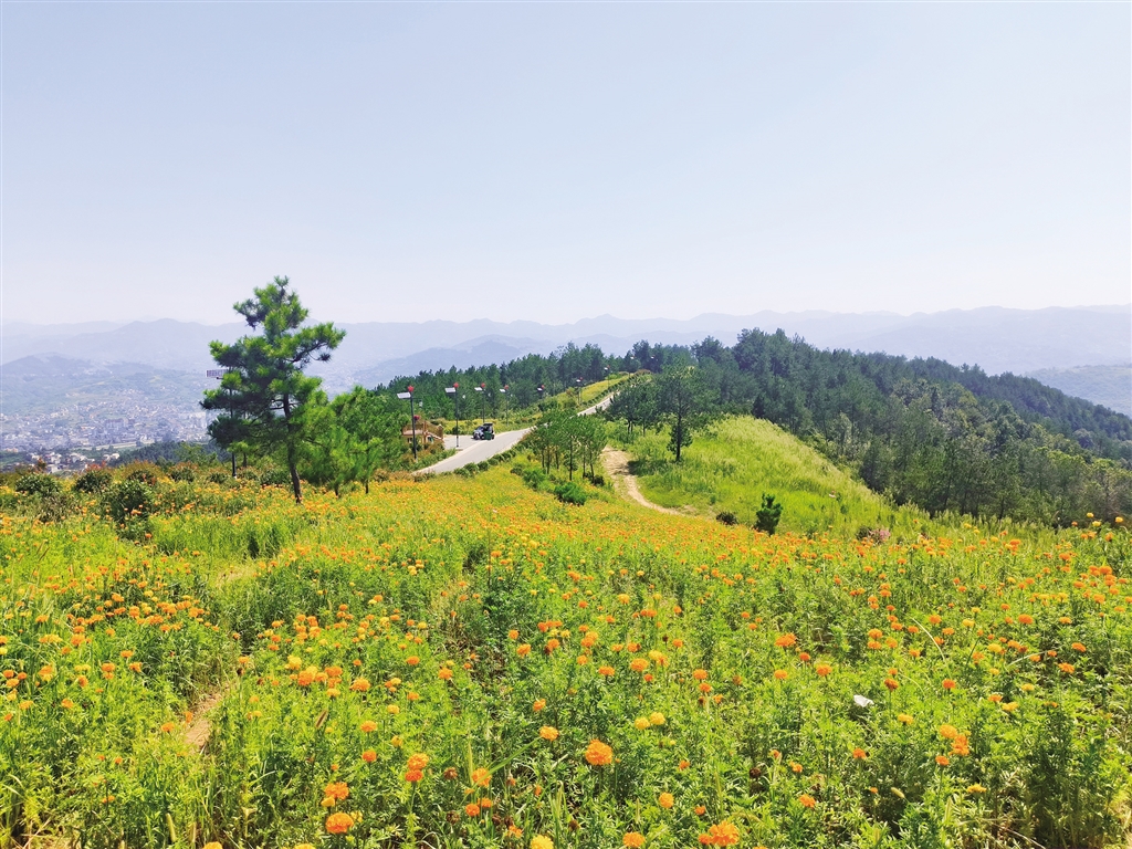 现在的牛蹄岭已然成了安康城区市民休闲纳凉的好去处,特别是下午夕阳西下时,大量人群涌入到牛蹄岭景区,在兴贤塔向东一百米左右,穿过彩虹柏油路便可抵达一大片万寿菊竞相绽放的花海,花团锦簇的场景引得路人驻足观赏、打卡留影。徜徉在花海、蓝天、白云、微风、虫鸣组合而成的风景里,身心都倍感愉悦。在这里不仅可以看到花海,站在观景台远眺,安康城区的景色也可一览无余。待到夕阳西下时,与夕阳、花海合影留念,颇有“满城尽带黄金甲”之感。