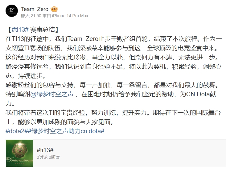 直播吧9月10日讯 Ti13国际邀请赛败者组首轮,Team ZeRo以0-2不敌1win,止步首轮被淘汰,赛后Team_Zero官方发布赛事总结。