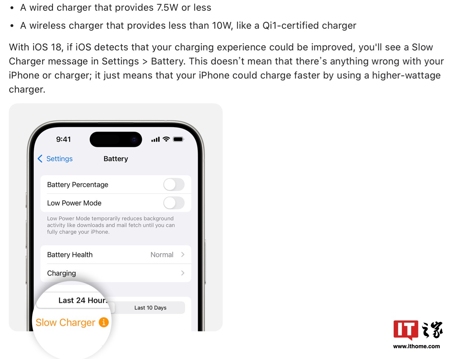 IT之家查询苹果官网获悉,用户可以在设置应用的“电池”中查看相关电量图表,如果用户当前正在使用低于 10W 无线充电器或低于 7.5W 的有线充电为设备充电,用户将看到一条提示消息,并且图表本身也会更新为新的橙色,以明确指示正在使用慢速充电器。