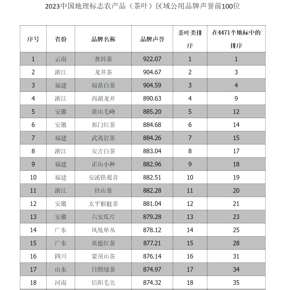 备注:以上前100位品牌中,不包含咖啡、莓茶等茶替代品地理标志品牌。