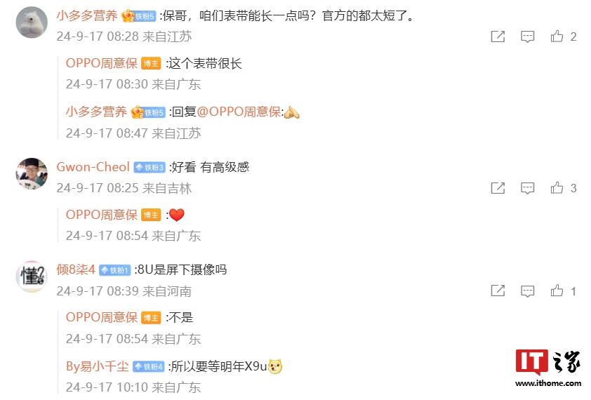 周意保在评论区中回复了部分网友的问题:针对表带长短的问题,他表示“这个表带很长”;针对“8U 是屏下摄像吗”,他进行否认(此处的 8U 预计为 OPPO Find X8 Ultra 手机)。
