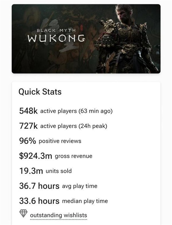 据悉,《黑神话:悟空》自发布以来,在全球范围内迅速积累了大量粉丝,发售四天,销量突破1000万份,发售不到一个月,销量已达2000万份左右,成为历史上销售速度最快的游戏之一。