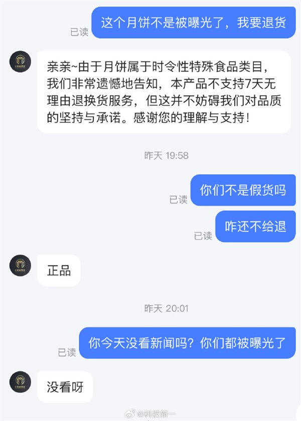 聊天截图显示,官方客服表示:“由于月饼属于时令性特殊食品类目我们非常遗憾地告知,本产品不支持7天无理由退换货服务,但这并不妨碍我们对品质的坚持与承诺。感谢您的理解与支持!”