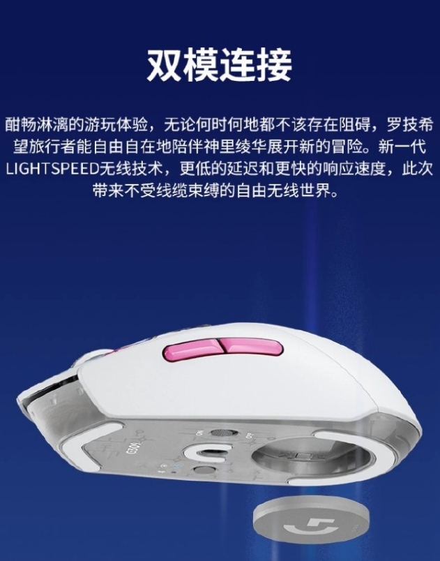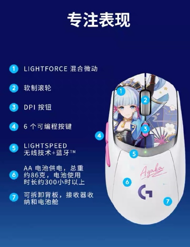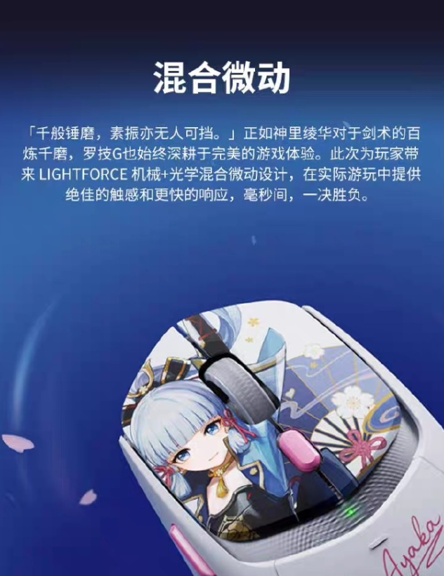 该鼠标基于罗技 G309 鼠标打造,白色底色搭配神里绫华左右按键图案,侧键为粉色设计。