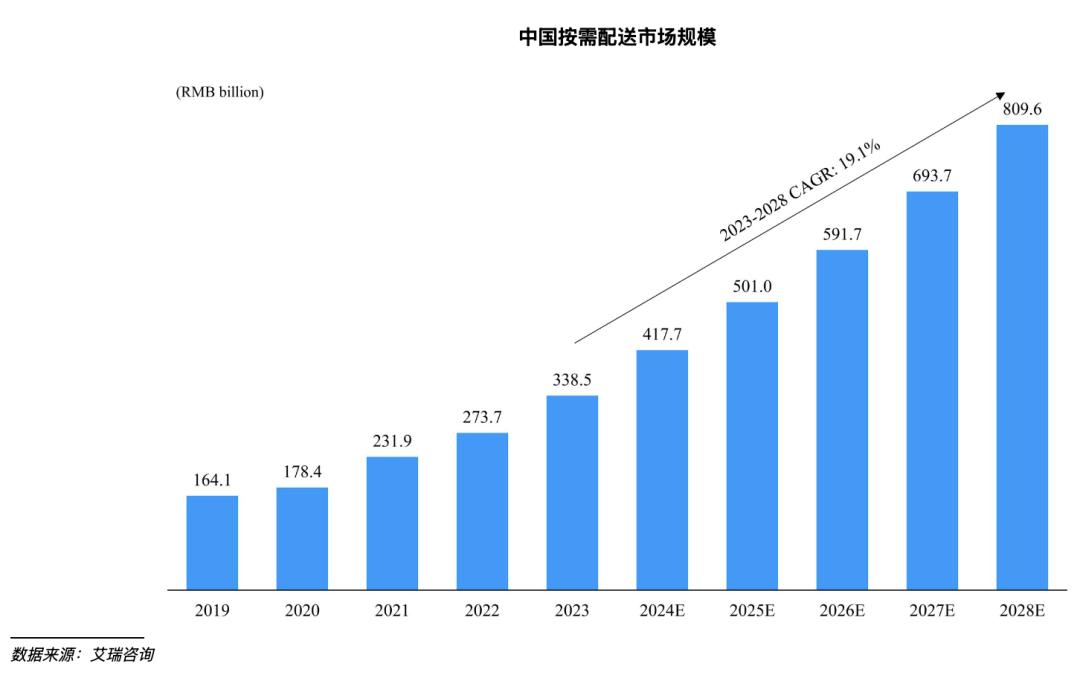其中,给骑手的薪酬和奖励占了大头。同期,闪送付给骑手的薪酬与奖励分别为27.51亿元、36.14亿元、39.75亿元、19.51亿元,分别占收入的90.5%、90.3%、87.8%、85.4%。 这部分成本难以压缩。 闪送在招股书中称,骑手和闪送之间不是雇佣关系,采用的是众包形式。有从业者介绍,众包骑手的履约成本比雇佣专职骑手低,但他们往往忠诚度也不高,经常会同时接多个平台的单,人员流动性大。为了保证有足够的运力,闪送需要开出有竞争力的薪酬,否则骑手就会转投他处。艾瑞咨询数据显示,闪送骑手每笔订单的收入高于中国按需配送服务市场中其他骑手的平均收入。 收入成本占比高,也导致闪送近几年的毛利率都徘徊在10%左右。2021年、2022年、2023年与2024年上半年,其毛利率分别为6.2%、6.5%、8.7%和11.3%,毛利分别为1.89亿元、2.59亿元、3.95亿元和2.57亿元。 毛利率增长的主要原因是近3年来,闪送的收入增幅高于收入成本的增幅,背后或许是随着订单数据的不断增加,闪送的算法分发效率逐渐提升。 但对比同样是提供即时运输服务、同样依靠大数据和算法提升效率的滴滴,闪送的毛利率仍较低。2024年Q1、2024年Q2,滴滴毛利率分别为17.1%、18.6%。 毛利水平的高低,决定了这项业务的变现空间有多大。总的来说,闪送提供的独立按需专职快递服务不是一门轻松的生意,毛利率不高的同时,每单平均收入也在下降。 上市,挑战刚刚开始 闪送将自己所处的市场定义为“独立按需专线快递市场”,加了“独立”和“专线”两个定语。 “专线”是指闪送会将每个包裹派送到专门的配送员手中,由其负责从头到尾的履行流程,不再合并订单,相较传统同城快递时效性与安全性更高。 “独立”则表示闪送是根据市场需求分配资源的独立服务提供商,而非依赖于关联电子商务平台需求的“专属专线快递服务提供商”。 加上了这两个定语,闪送在“独立按需专线快递市场”这一细分领域的市场份额为33.9%,排名第一。 但是,在整个按需配送市场,闪送的市场份额并不出众。 根据艾瑞咨询的数据,2019年至2023年,中国按需配送市场的总市场规模从1641亿元增长至3385亿元,复合年增长率为19.8%,预计到2028年市场规模将以19.1%的复合年增长率增长至8096亿元。