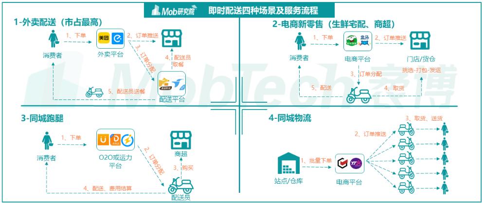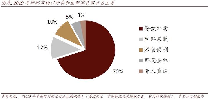 2022年Mob研究院的一份研报显示,即时配送服务中,外卖配送业务为最主要的场景,呈现出美团配送和蜂鸟即配双龙头竞争态势。闪送主打的“一对一”配送,所占的市场规模较小。 中金公司2020年发布的《即时配送:数字经济赋能的蓝海市场》也显示,2019年,即时配送的应用场景中,餐饮外卖订单量占比 70%、生鲜宅配占比12%、 商超便利占比10%、鲜花蛋糕占比5%、C2C配送(“一对一”配送)占比3%。