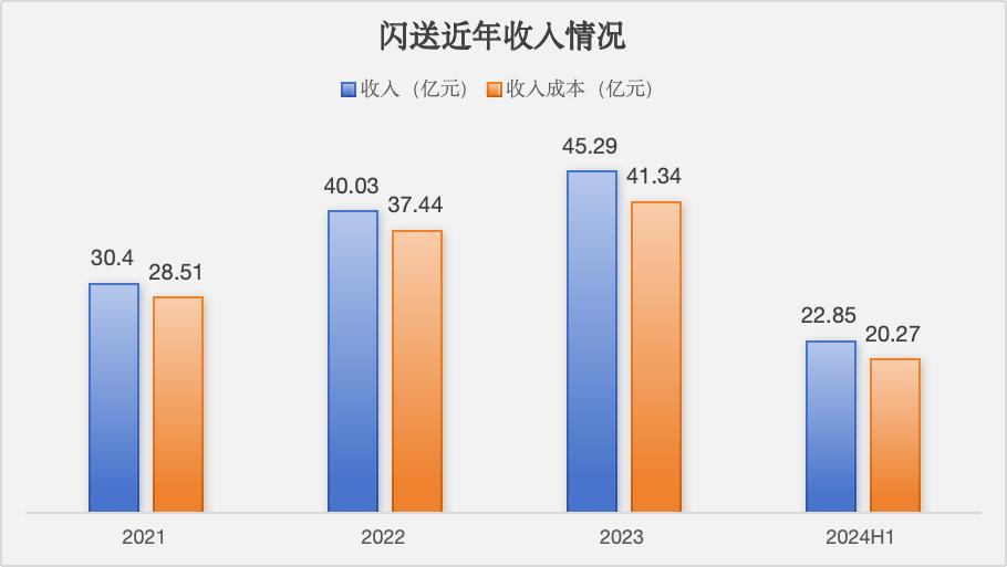 截至2024年6月30日,闪送拥有约270万注册骑手,注册用户约8890万;服务范围覆盖中国295个城市,每位活跃骑手的每日订单数量为9.3个,平均送货时长为27分钟。 招股书显示,闪送的所有收入都来自于向客户提供按需专用快递服务的收费。也就是说,赚的是辛苦钱,全靠一单单累计。 近三年,闪送的订单量呈上升趋势。2021年、2022年、2023年以及2024年上半年,闪送分别完成了1.59亿份、2.13亿份、2.71亿份和1.38亿份订单。 同期,对应的收入分别为30.40亿元、40.03亿元、45.29亿元、22.85亿元。 我们简单算一笔账,用收入除以订单数量可以得出,其同期每单平均收入分别为19.1元、18.8元、16.7元、16.6元。 所以,尽管订单数量在上升,但每单能带来的收入呈下降趋势。这对于闪送来说,不是个好消息。每单平均收入下降的原因可能是用户的支付意愿在降低,或是面对激烈的竞争时,闪送要通过降价来维持订单增速。 在如今的大环境之下,用户未来是否愿意继续支付较高的快递费用,是闪送将要面临的一大挑战。 此外,闪送的经营业绩会受季度性波动影响。例如,农历新年期间客户和骑手的活跃度较低,导致第一季度的订单量通常低于第四季度。 再来看成本方面,2021年、2022年、2023年以及2024年上半年,闪送的收入成本(与收入相关的成本)分别为28.51亿元、37.44亿元、41.34亿元、20.27亿元。